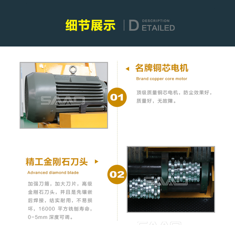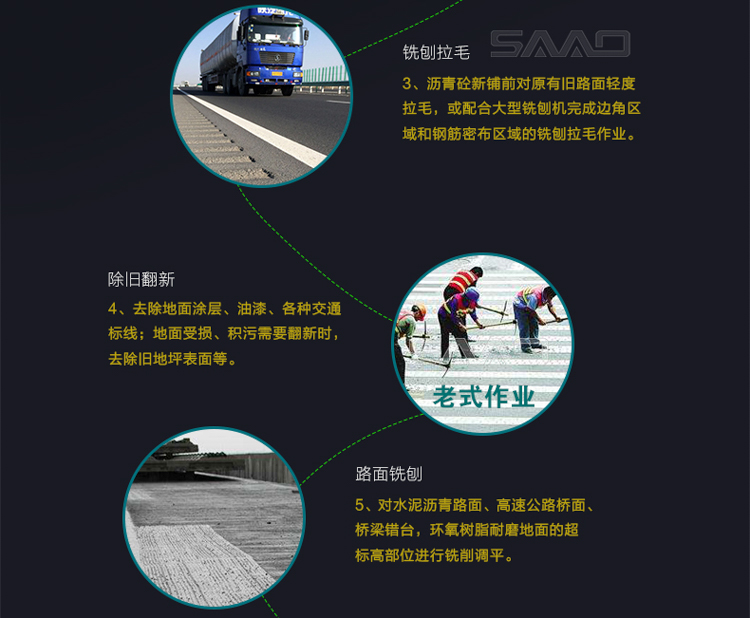 用于橋面鋪設瀝青或車間舊的混凝土地面重新攤鋪混凝土之前,清除水泥浮漿以及鏟平拉毛,也用于清除建筑施工中遺留的堅硬灰渣。