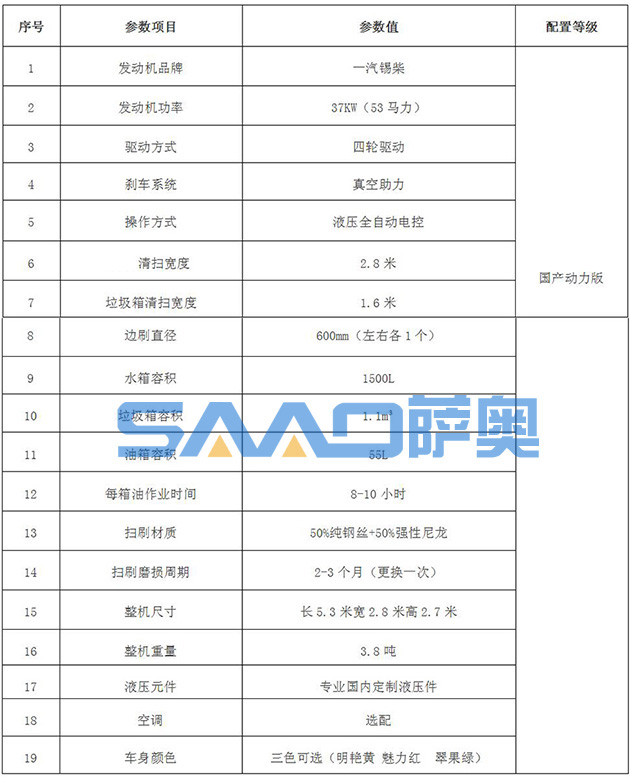 薩奧路面保潔養護清掃機(SA-280Q),高壓水泵噴霧除塵,動力強勁、超大水箱、垃圾可回收,大容積垃圾箱,自動卸料,垃圾自動裝車,裝車高度3米、自動檔駕駛操作簡單靈活,兩邊盤刷作業讓死角無殘留。一機多用,多裝置快換技術,是道路養護的清掃裝備,廣泛用于國道、省道、縣道及農村公路養護清掃工作。