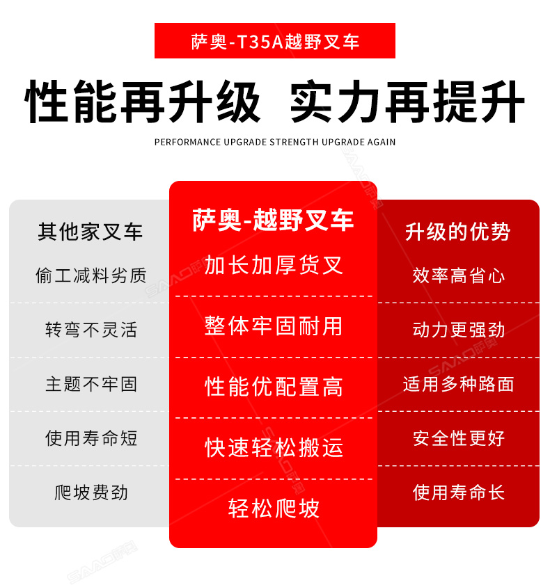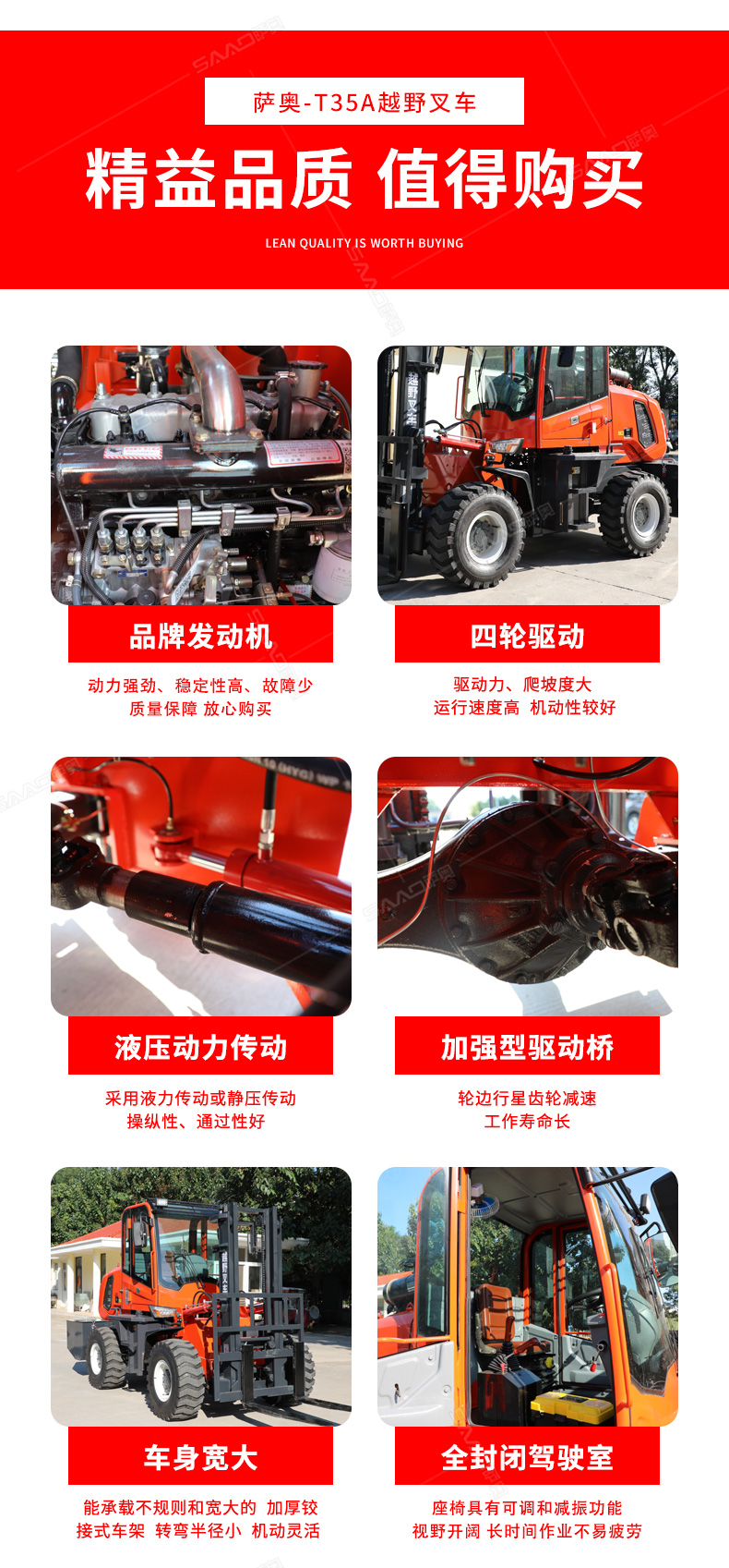 9.越野叉車(chē)杰出的離地間隙,特制的越野輪胎。前橋帶防滑差速裝置的四輪驅(qū)動(dòng)。使發(fā)動(dòng)機(jī)與變速箱之間上設(shè)計(jì)的更加緊湊。能夠在惡劣的地區(qū)如崎嶇地形,沙地和泥地上作業(yè)。