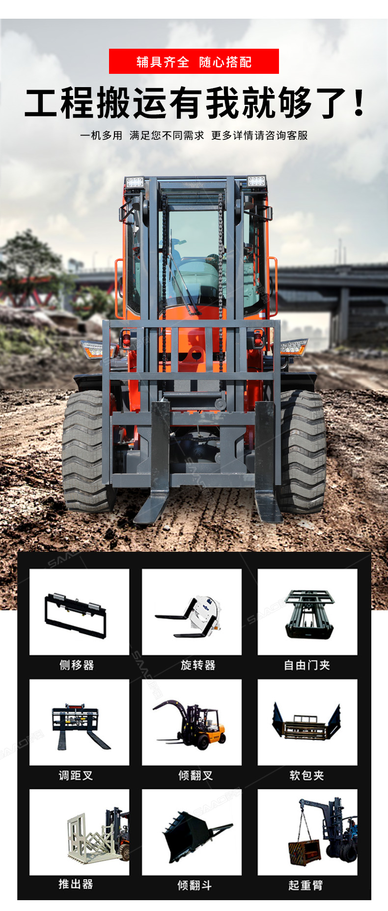 越野叉車(chē)可以在坡地和不平地面上進(jìn)行貨物裝、卸、堆垛及搬運(yùn)作業(yè),具有良好的機(jī)動(dòng)性、越野性可靠性。其功能多樣,可搭配側(cè)移器、調(diào)距叉、旋轉(zhuǎn)器、軟包夾、推出器、側(cè)翻叉、側(cè)翻斗、起重臂等工具完成不同的工作。