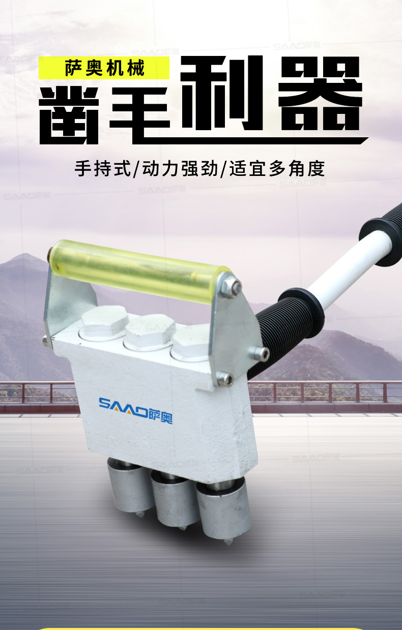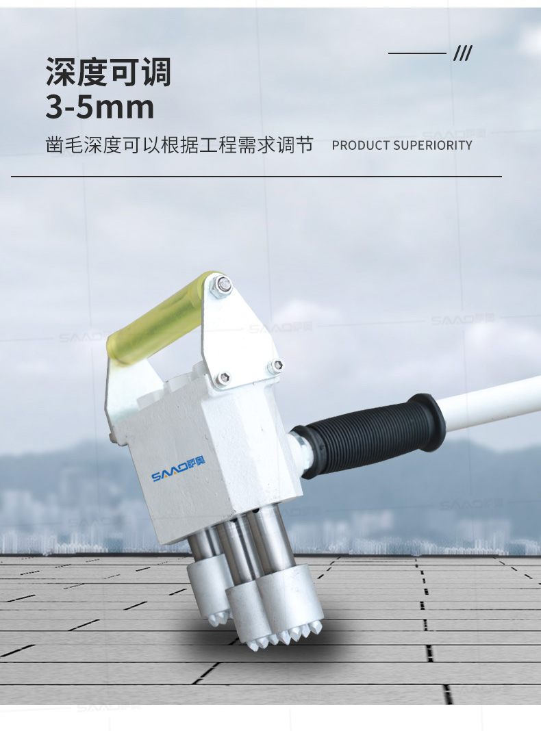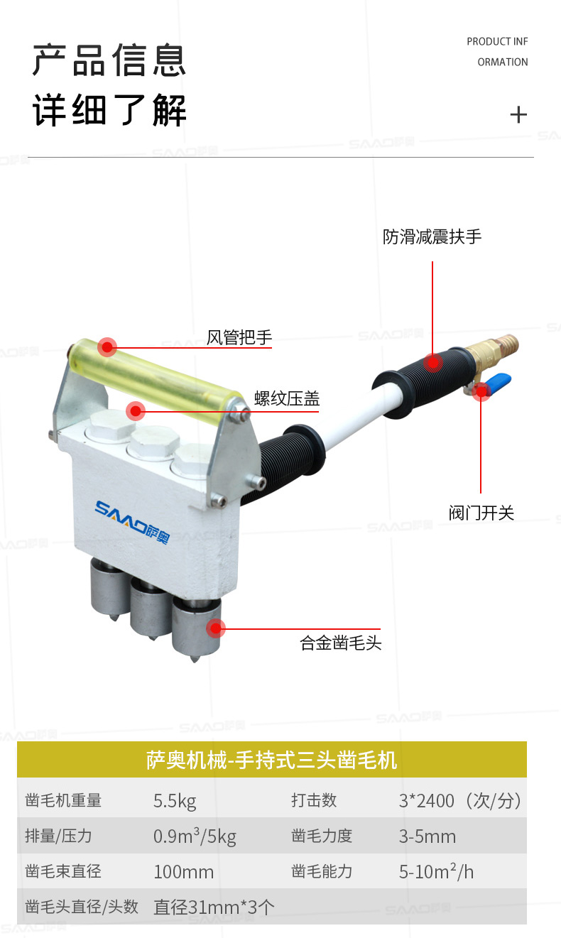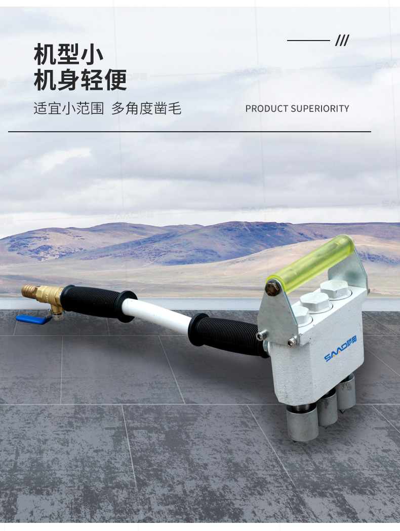 手持式三頭鑿毛機技術參數: 鑿毛機重量:5.5kg 打擊數:3*2400(次/分) 排量/壓力:0.9m/5kg 鑿毛深度:3-5mm 鑿毛束直徑:100mm 鑿毛能力:5-10m/h 鑿毛頭直徑/頭數:直徑31*3 手持式三頭鑿
