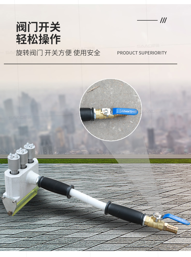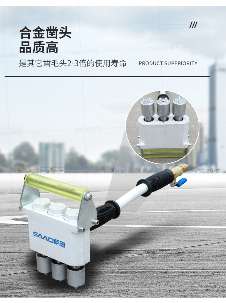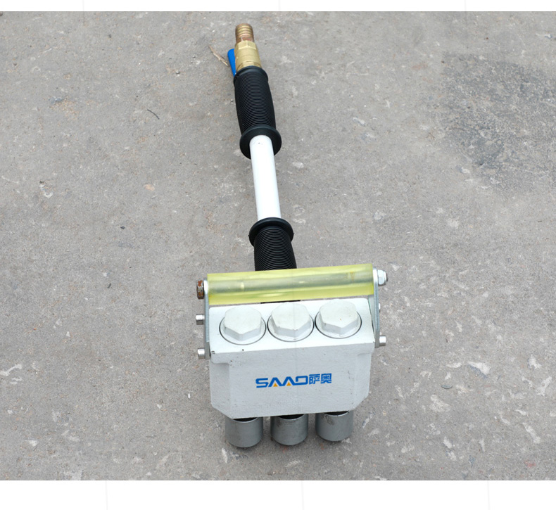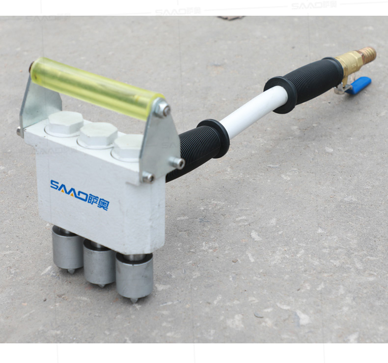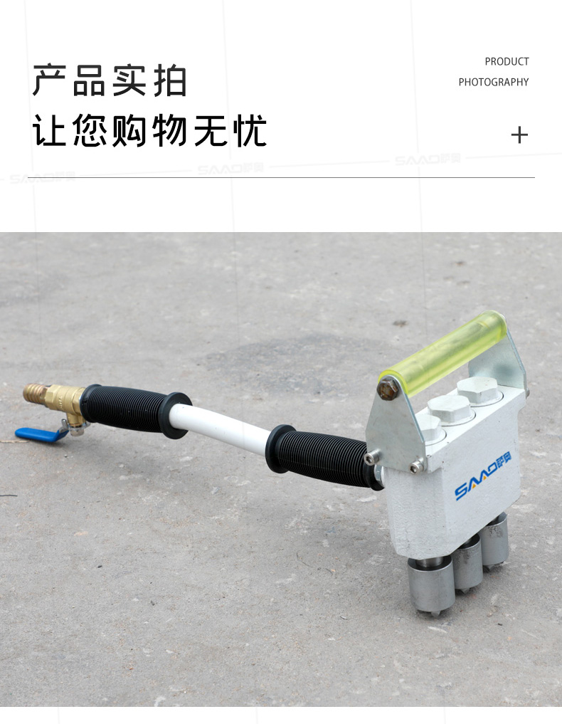 手持式三頭鑿毛機技術參數: 鑿毛機重量:5.5kg 打擊數:3*2400(次/分) 排量/壓力:0.9m/5kg 鑿毛深度:3-5mm 鑿毛束直徑:100mm 鑿毛能力:5-10m/h 鑿毛頭直徑/頭數:直徑31*3 手持式三頭鑿