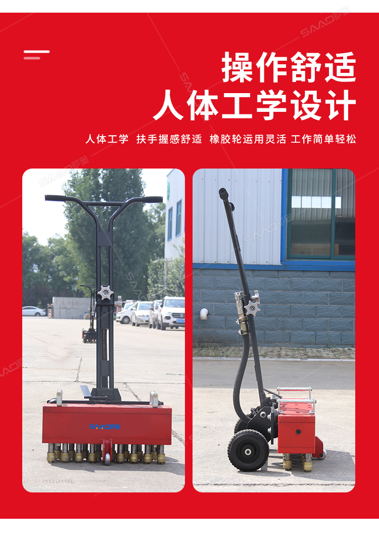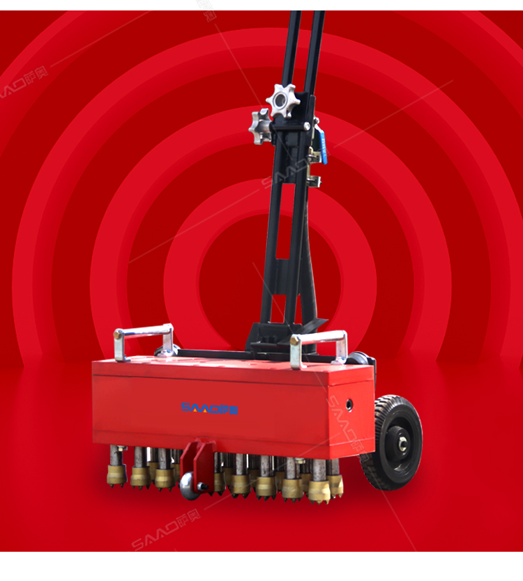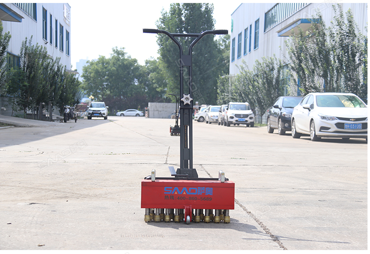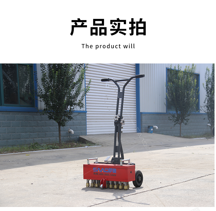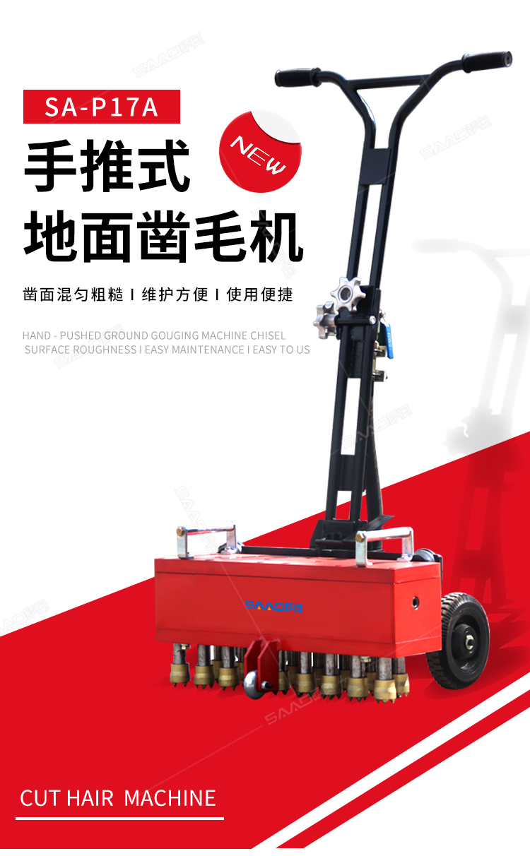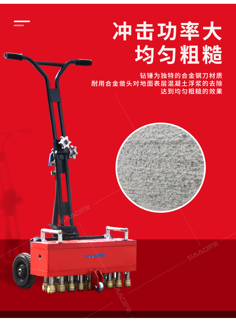 手推式地面鑿毛機,主要為高速公路、高速鐵路的橋面、機場、橋梁、停車場等各種混凝土地面新建鋪裝時對地面表層混凝土浮漿的去除,達到均勻粗糙而設計的。對各種陳舊地面做翻