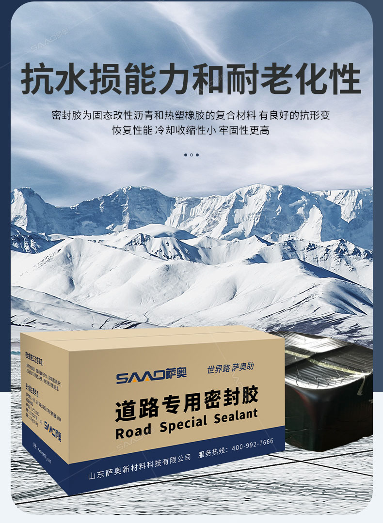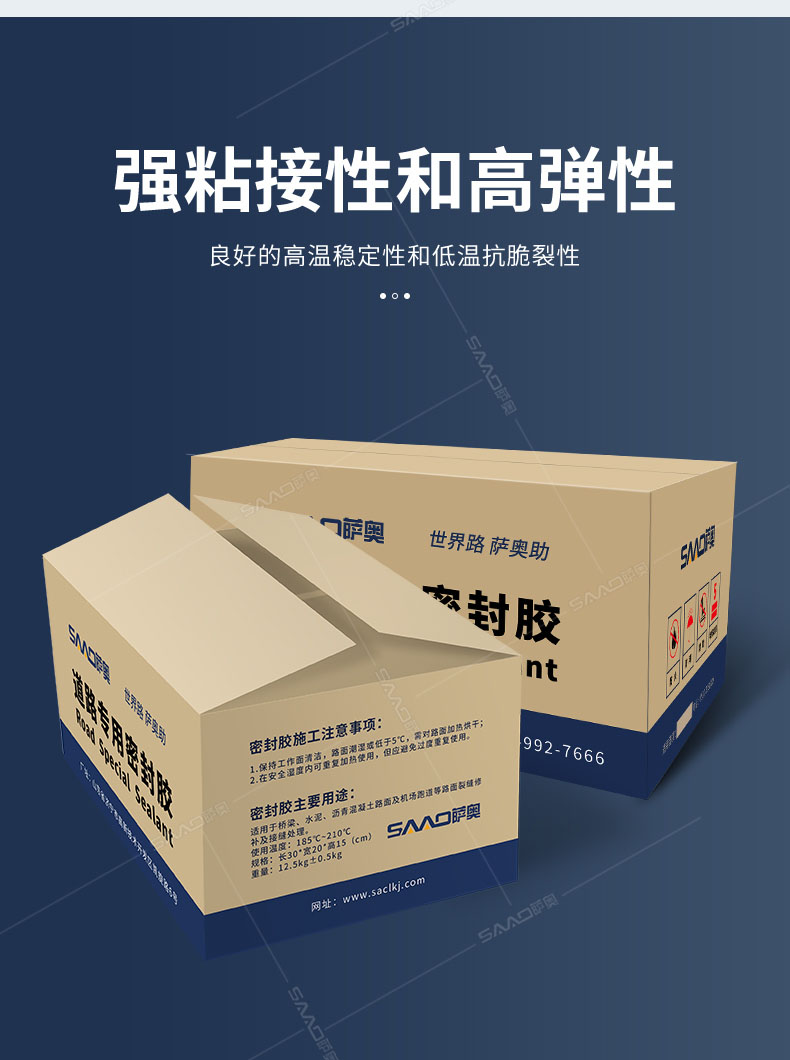 薩奧系列密封膠為固態改性瀝青和熱塑橡膠的復合材料,熱熔快,粘接性強,具有良好的抗形變恢復性能。與其它類型密封膠相比,該類型具有低稠度,易于滲入各種裂縫等特點。在夏季,其高溫軟化點可達96℃;在冬季,其耐低溫可達近似-23℃,因此更適合在溫差跨度大的溫帶環境。