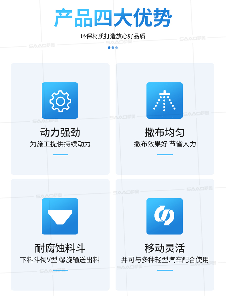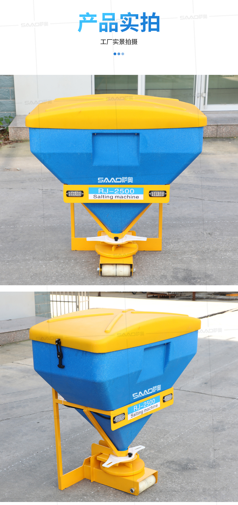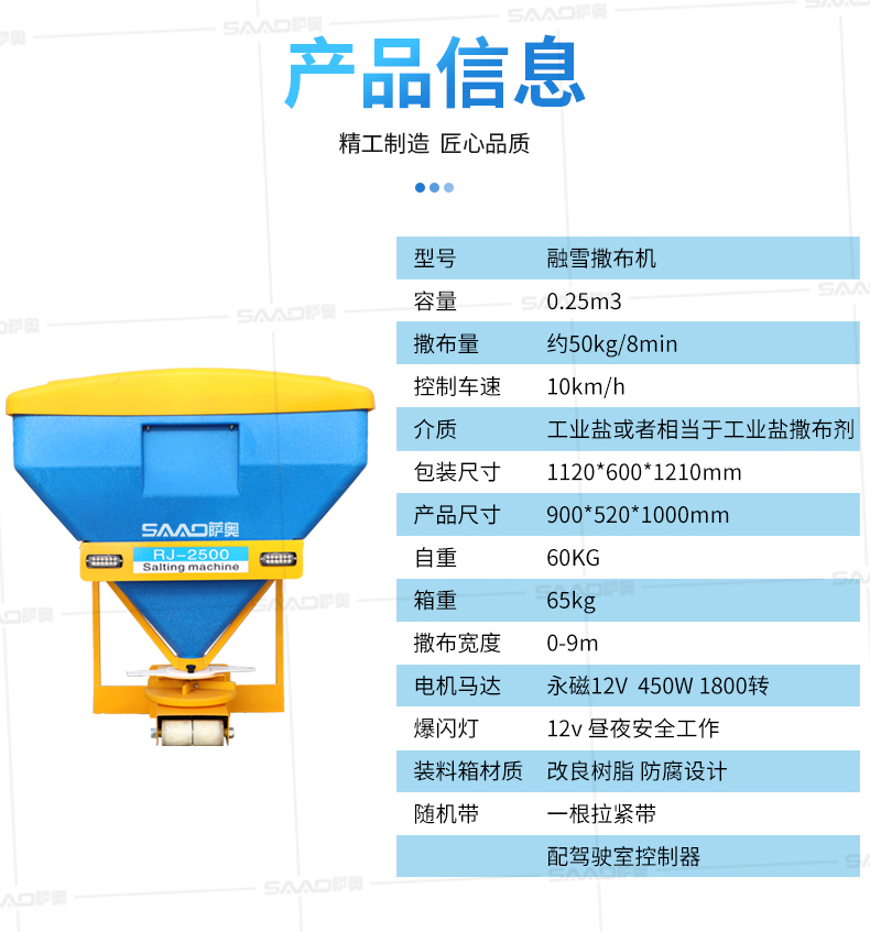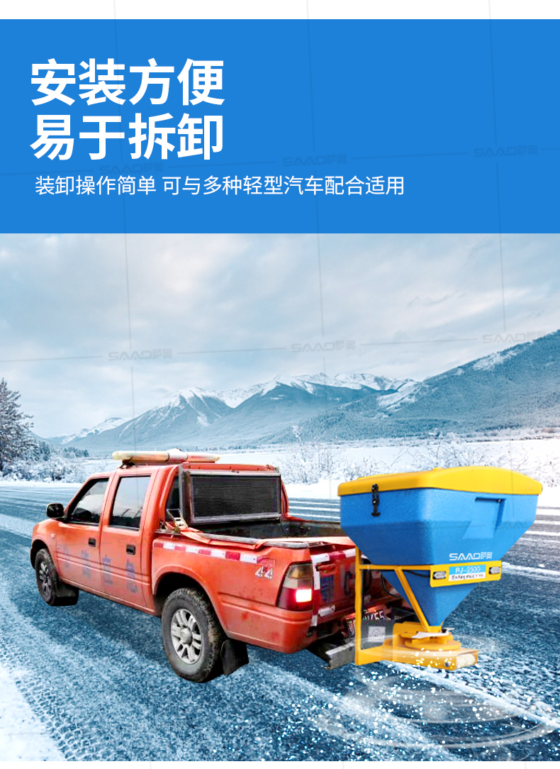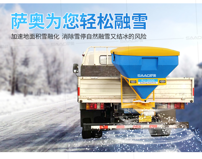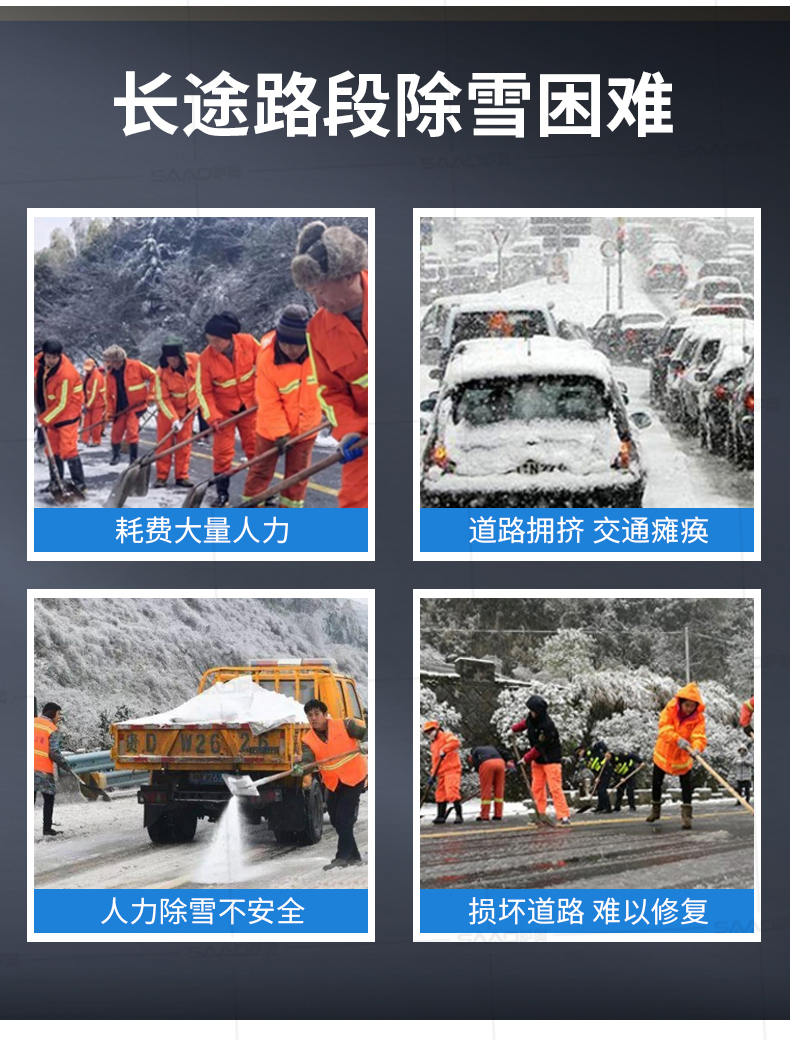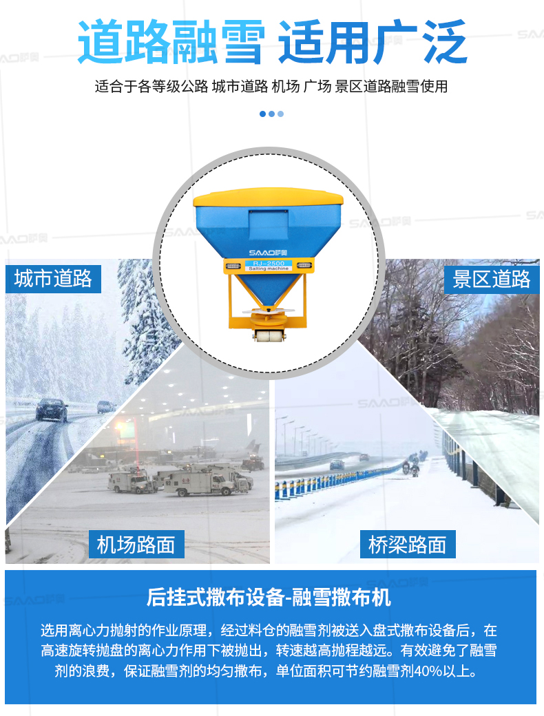 本產品用于道路、小區、廣場等地面積雪的融雪布撒,用以加速地面積雪融化,消除雪停自然融雪又結冰的風險。