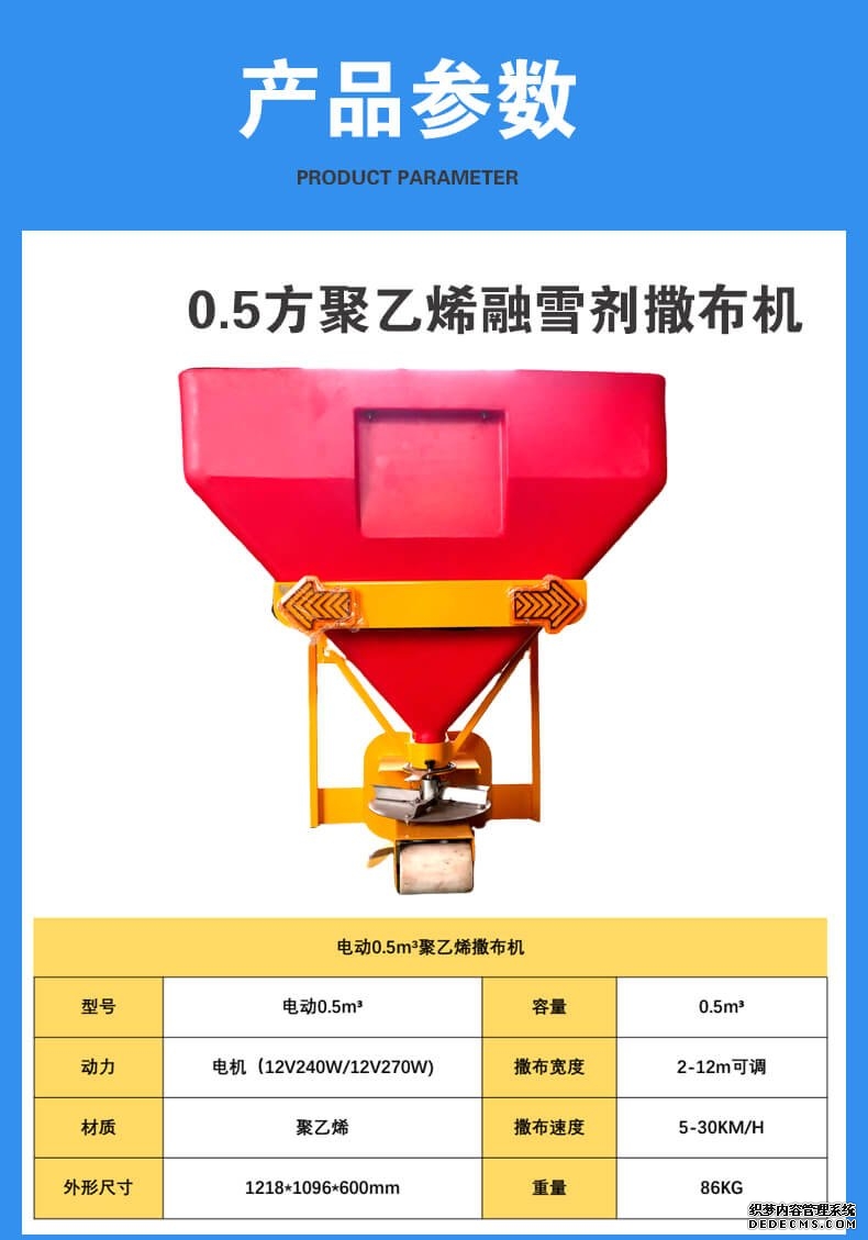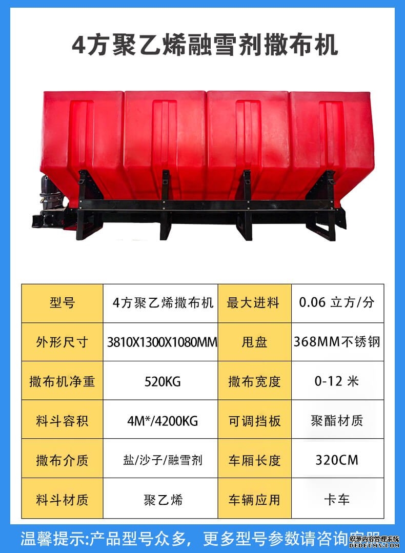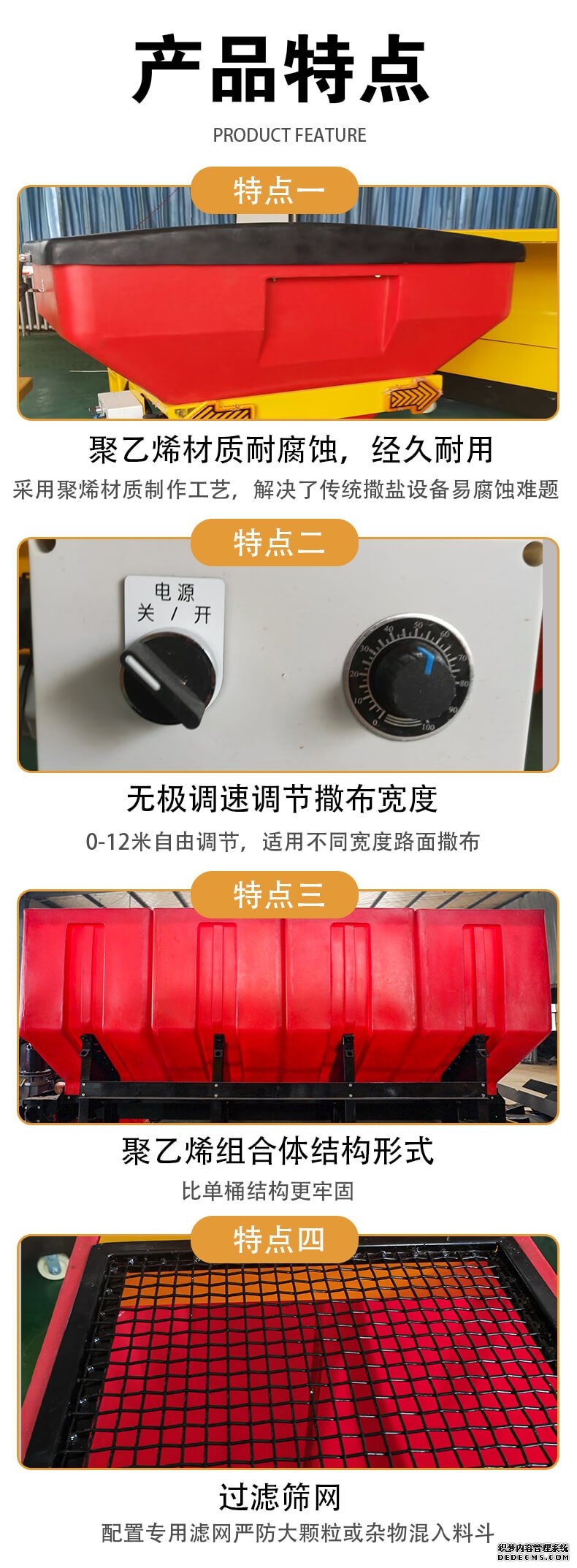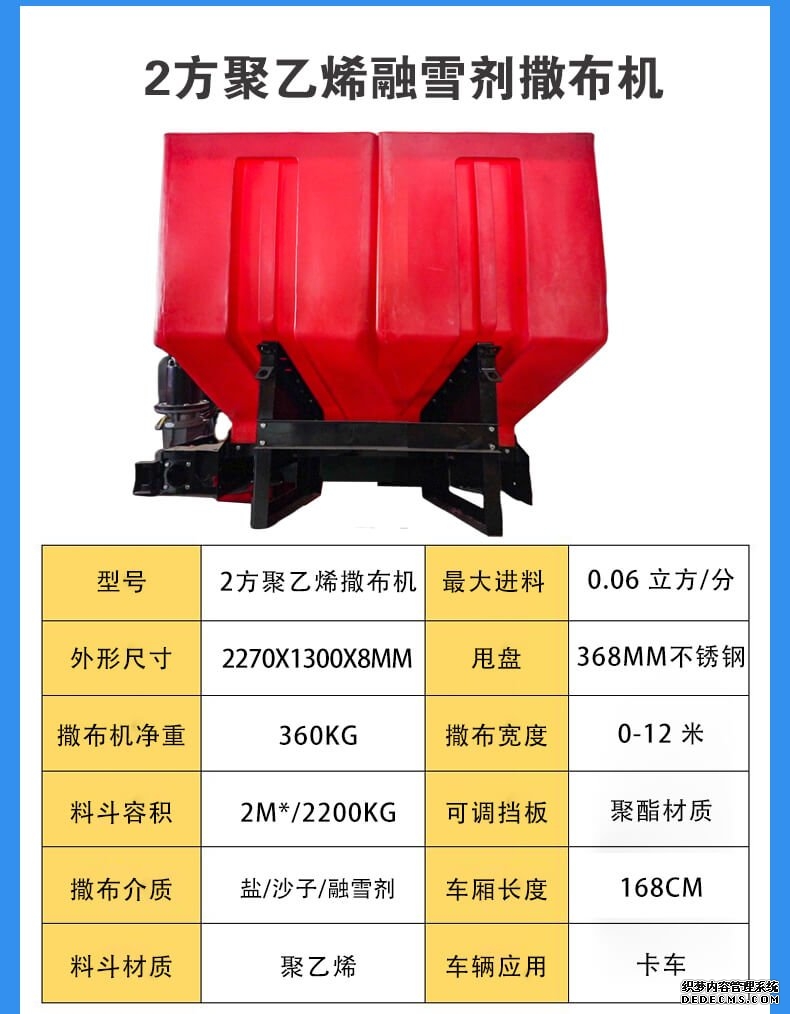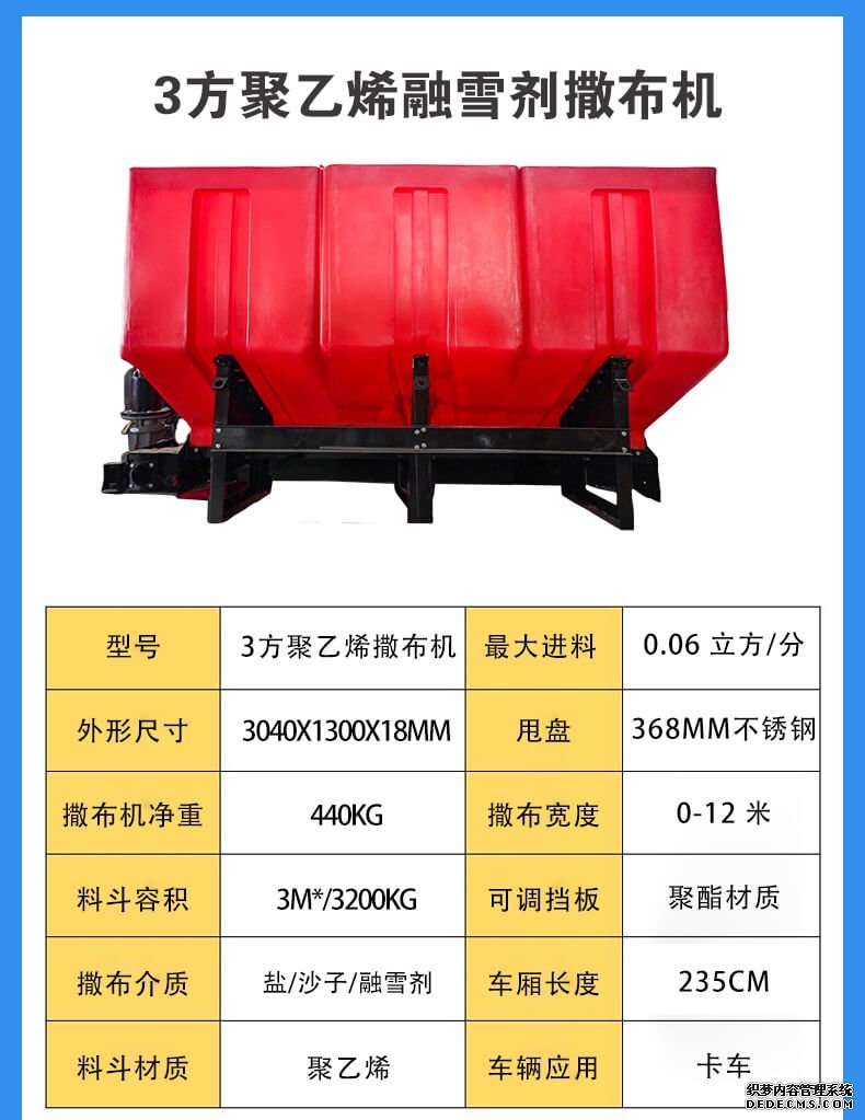 融雪劑撒布機是車載式撒布機,適用于冰雪路面防滑沙料和融雪劑的撒布,是市政公路、高速公路的融雪撒布的便利設備。