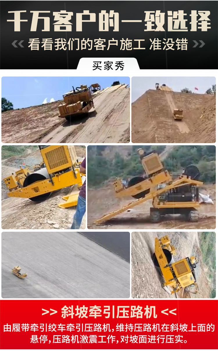 帶絞車斜坡壓路機是由壓路機和牽引絞車共同組成的協同工作的壓路機,使用于大距離,大傾角的坡面工作。 在泥土壩,河道邊坡等具有傾斜角度的斜坡地面上,常規的大型壓實機械無